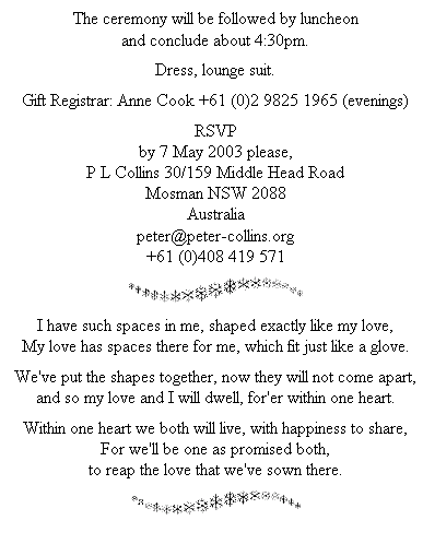 On the day, Cecily lent a good-humoured, natural dignity that brought a proper decorum to the official activities, and left no doubt in our minds - nor anyone else's, we are sure - that the ceremony we were enacting, though joyful, was at its core the undertaking of a serious, formal, binding contract.